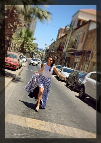 Этот образ предложила мне Наталья Клостер: нарядный атласный лиф с открытой спиной и юбка с неровным кроем, расшитая черно-белыми оборками. Выглядит очень празднично и при этом игриво. У меня не было с собой туфель, поэтому я импровизировала, сняла кеды и надела серьги с жемчужинами от Людмилы Коломацкой – получилась эдакая «сбежавшая невеста». Водители заинтересованно сигналили и выглядывали в окна своих авто, а я хохотала и подпрыгивала на месте, потому что спокойно позировать босиком невозможно, ибо бег по раскаленному асфальту Тель-Авива сравним только с ходьбой по горячим углям в школе для йогов. А вот если к выходу в свет подойти ответственно, добавить высокую прическу и туфли на шпильке, украсить шею ожерельем-чокером или голову диадемой, то девушка в таком наряде станет похожа на принцессу.