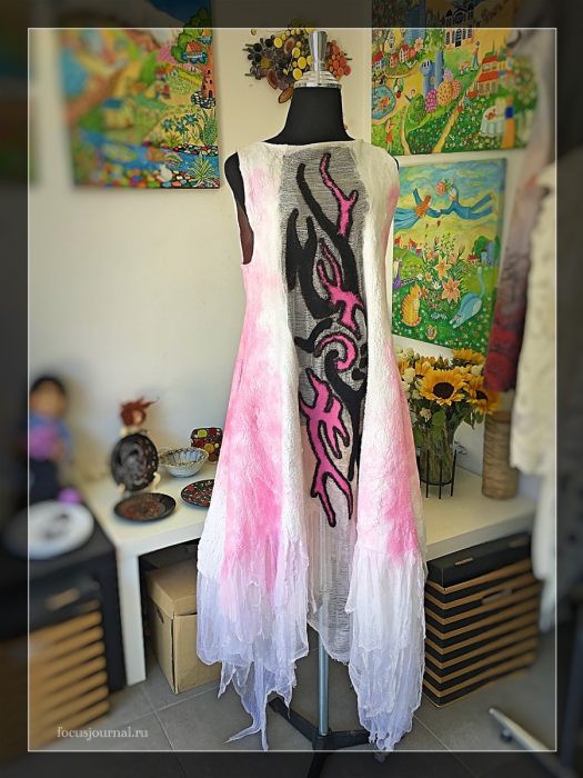 Какой простор для творчества дают дизайнерам оттенки белого – на белом выигрышно смотрятся как яркие и насыщенные цвета, так и тонкие, едва уловимые, пастельные. Эта одежда от Ларисы Адар создана в процессе валяния натуральных нитей вискозы, шерсти, шелка. Шерсть и вискоза отлично «дышат», так же как шелк, они поддерживают комфортную температуру в жаре или холоде, поэтому летом носить такие наряды не просто можно, но и нужно.