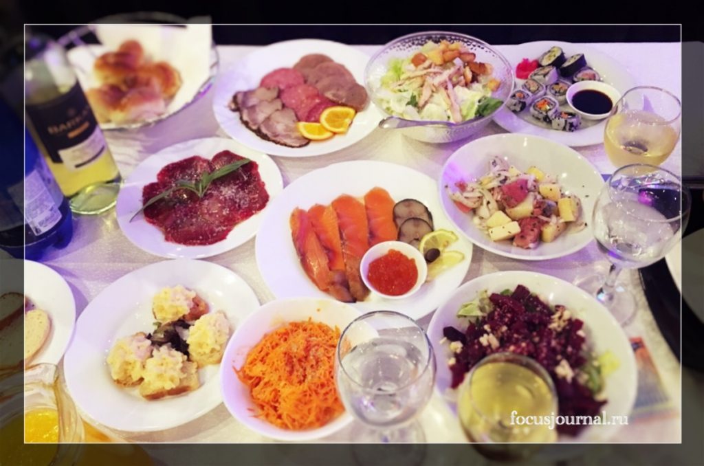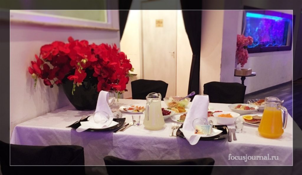 Начну с вкусного. Ты приходишь в зал, а тебя уже ждет стол, накрытый всевозможными яствами. Подают блюда русской и европейской кухни по банкетному типу: сначала холодные закуски, потом горячие закуски, за ними – основное блюдо, которое ты выбираешь a-la cart из восьми указанных (на русском или иврите – как больше нравится), а затем десерт и горячие напитки.