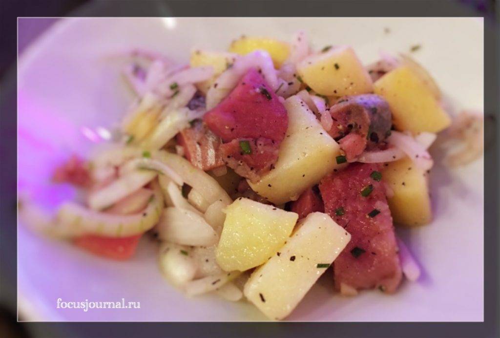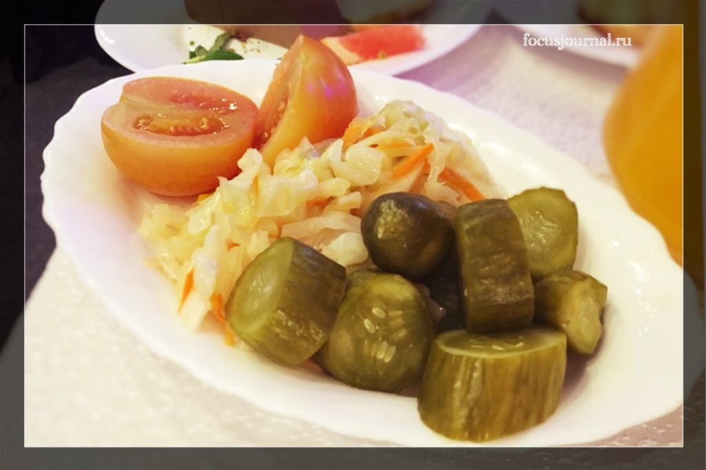 В качестве закусок нас сразу по прибытию ожидали традиционные соленья по домашнему рецепту и селедочка с вареным картофелем и лучком (любителям водочки на заметку!); рыба в кляре, суши с имбирем и васаби — как полагается, карпаччо из говядины, салат «цезарь» от шеф-повара, домашний куриный паштет с вареньем из жареного лука, свекольный салат, морковный салат, рыбка и колбаска копченые, язык вареный, икорка красная, пирожки, сырная закуска…
